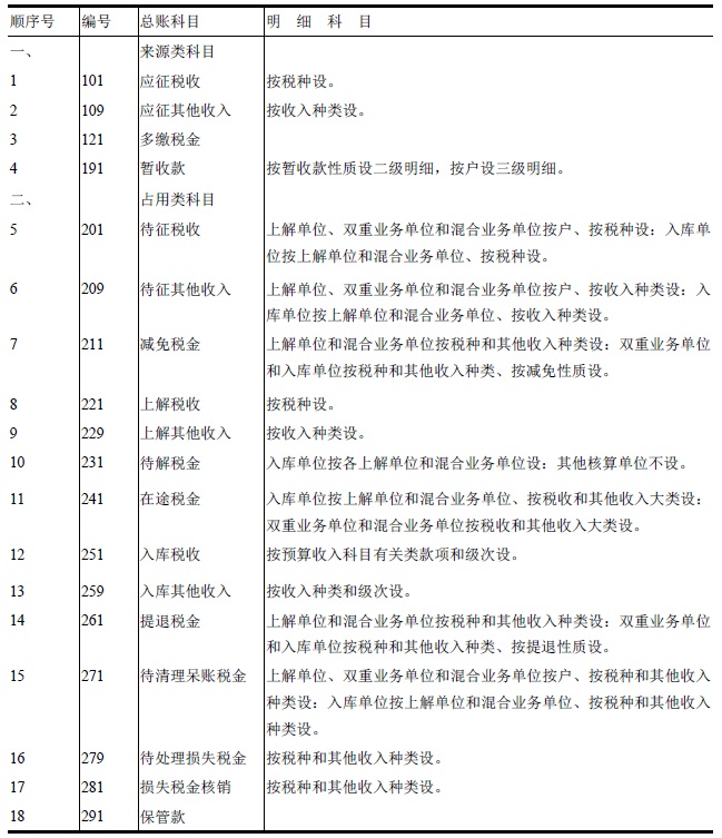 第十七条 根据现行税收制度和税收管理需要,以及国家预算收入科目和国家金库制度,税收会计科目按四种核算单位的业务情况综合设置如下: